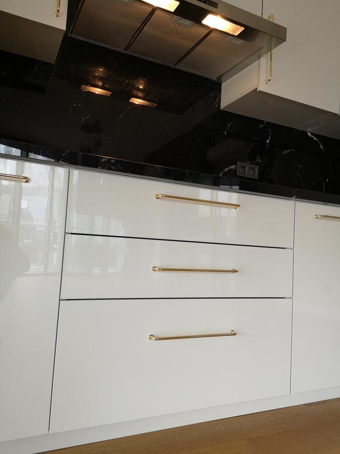 Beyaz akrilik, çizilmez kapakların modern çizgisini rustik bir tarza çeken özel kulplar müşterimizin seçimiydi. Öte yandan mutfağı tamamlayan siyah granit taşın ne kadarda görkemli ve şık durduğuna bakar mısınız?